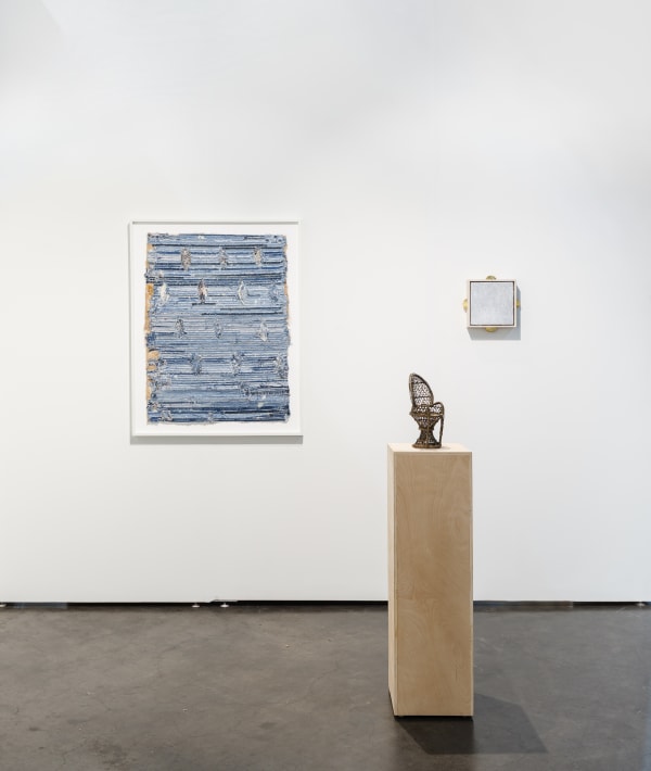For Untitled, Jamal Cyrus has created new fiber works and three new sculptures. The artist has been working with denim since 2018 and more recently has been pushing the material to create rich painterly abstractions, referencing free jazz and issues of metaphysics within Black sound production. All of the new sculptures are conceived as percussion instruments; the artist embeds history into their very material and form, drawing on symbolic, spiritual, and political references.